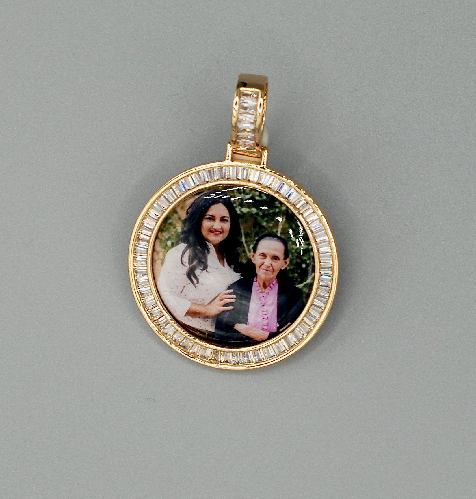 14k Gold or White Gold plated Round Baguette stone Custom 3D Photo Picture Charm Pendant 1.5 inch (39mm)